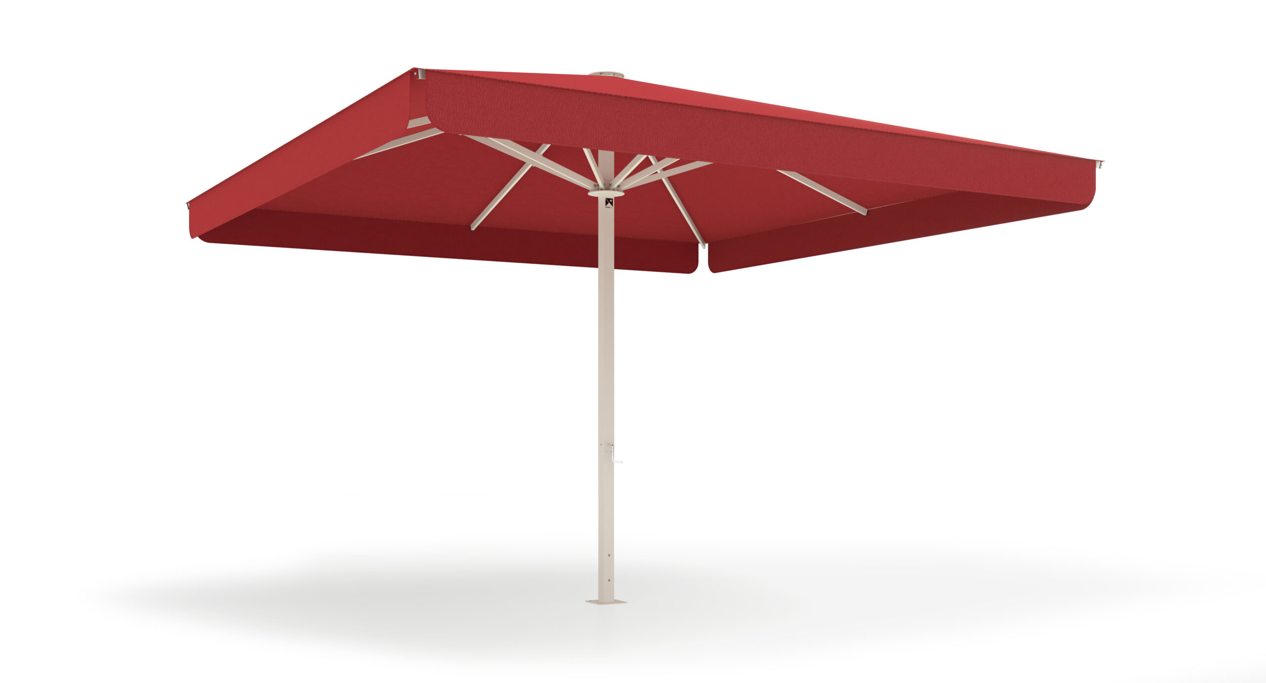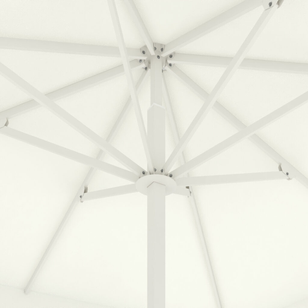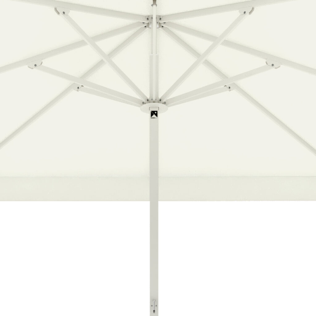 Parasol con mástil cuadrado de 70×70 mm, disponible en versión central o excéntrica. Formatos y medidas estandarizadas cada 50 cm, hasta 4,5×4,5 m, con 8 varillas.