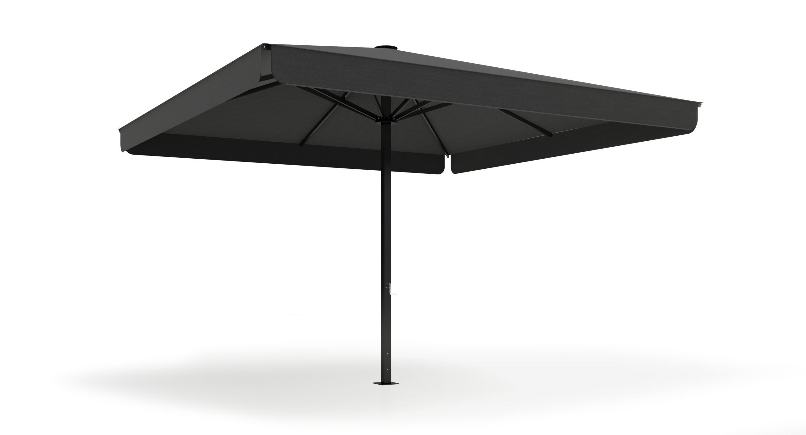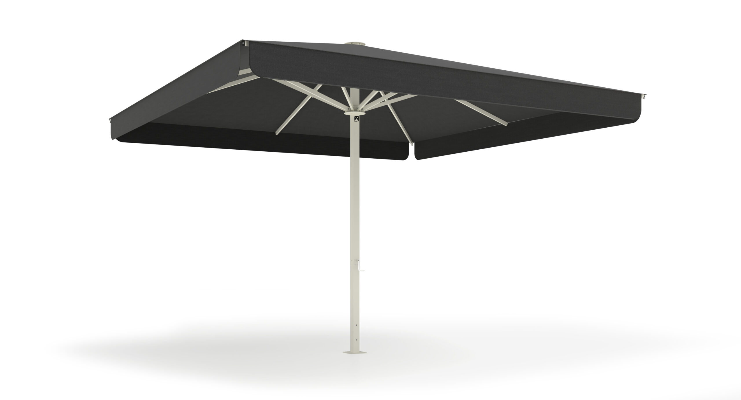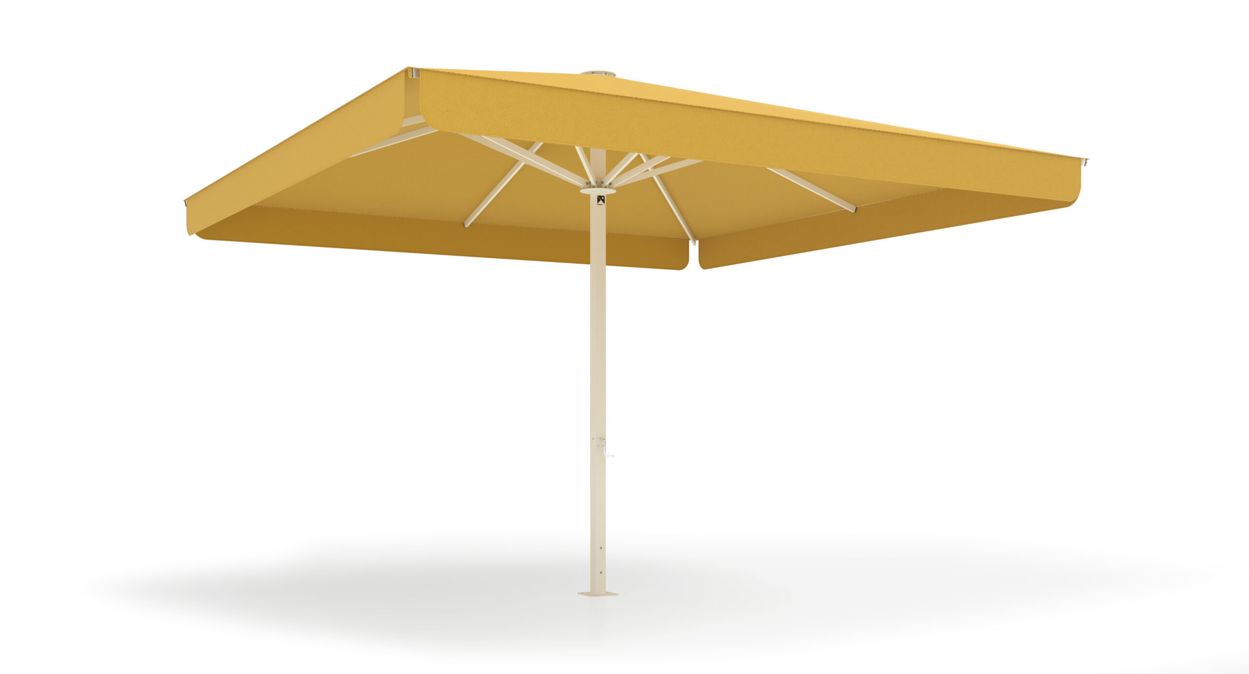 Parasol con mástil cuadrado de 70×70 mm, disponible en versión central o excéntrica. Formatos y medidas estandarizadas cada 50 cm, hasta 4,5×4,5 m, con 8 varillas.