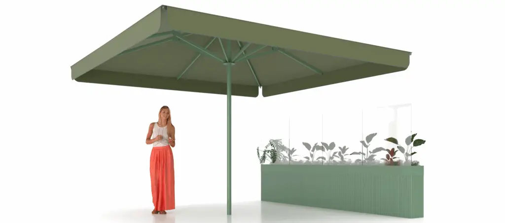 Parasol con mástil cuadrado de 100×100 mm, disponible en configuración central o excéntrica. Formatos y medidas estandarizadas cada 50 cm, hasta 6×6 m, con hasta 12 varillas reforzadas..