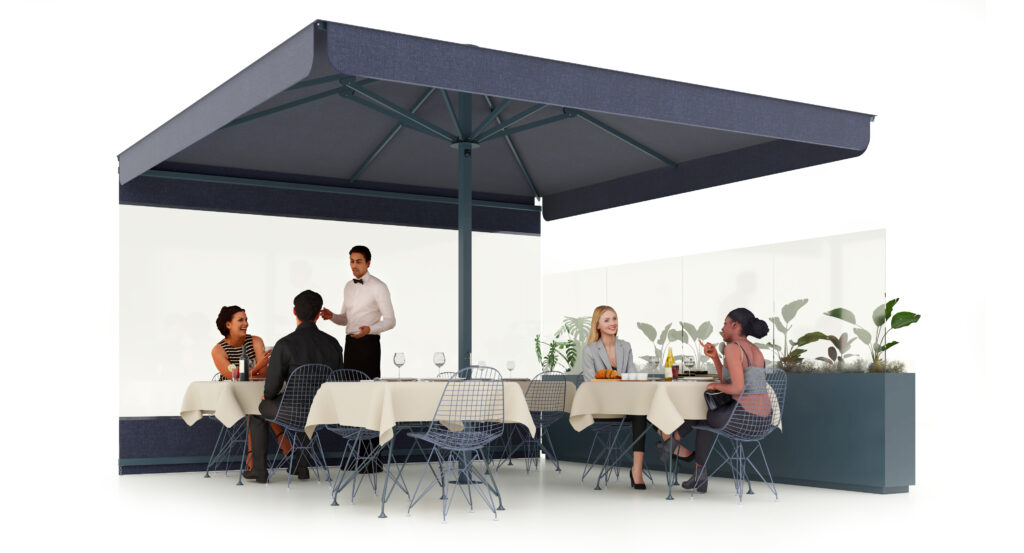 Parasol resistente a 60 km/h con mástil cuadrado de Ø70 mm, ideal para terrazas.